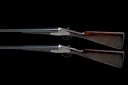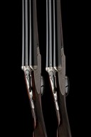 for 1974, 27 5/8in. (70cm) nitro barrels the ribs gold-inlaid 'I' and 'II' at the breech ends, the left tubes engraved in script 'Armi Famars', 2 3/4in. chambers, bored approx. 1/2 and full choke (No.I) and 1/4 and 1/2 choke (No.II), some minor pits, No.II left wall at 18, toplevers gold-inlaid 'I' and 'II', removable striker discs, automatic safeties, articulated front triggers, fully engraved with fine acanthus scrollwork interspersed with occasional floral sprays, the triggerplates signed 'R-VASCO-INC.', 16in. figured stocks, slightly cast on and swept for the left shoulder, including 1in. leather-covered recoil pads, weight 6lb. 13oz. (No.I) and 6lb. 14oz. (No.II), in a leather case