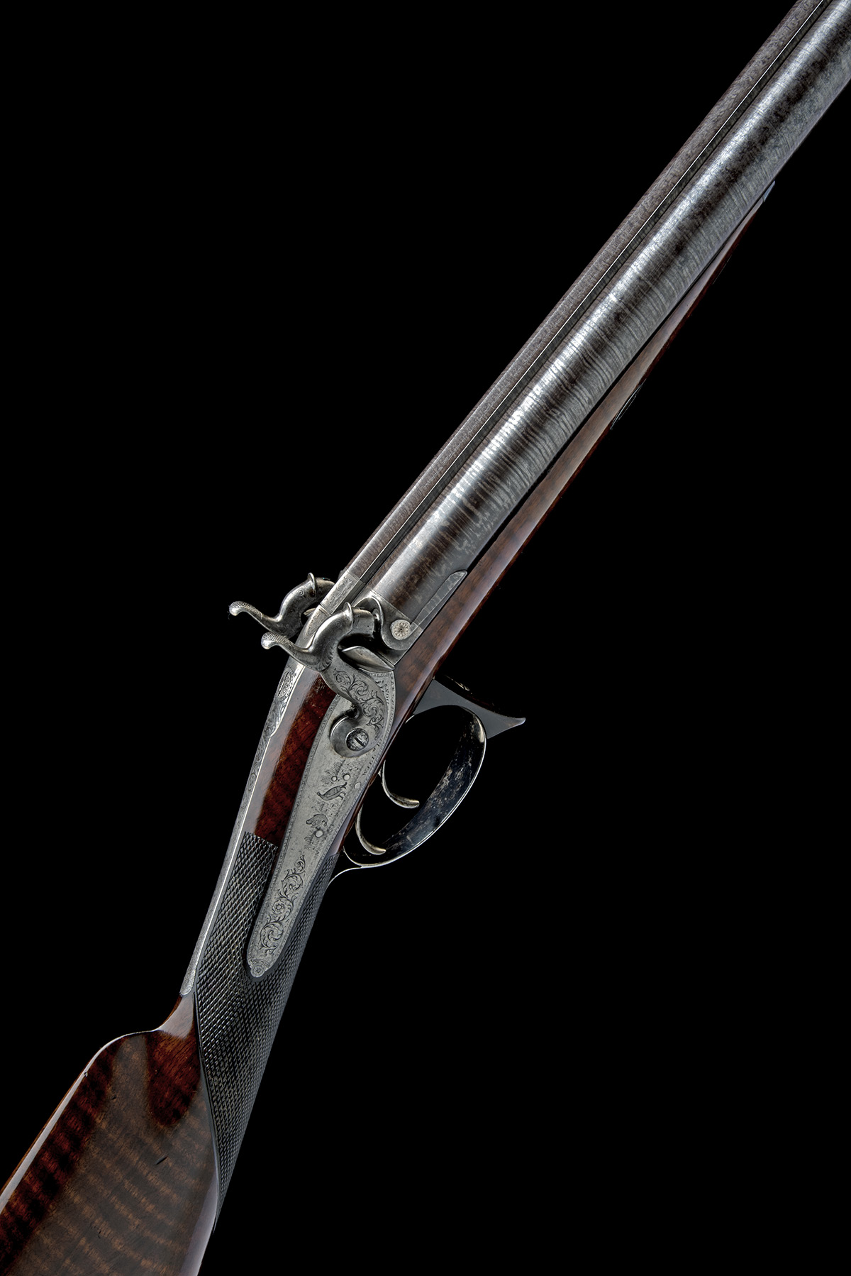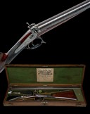 circa 1850, with browned laminated 30 1/4in. barrels, the raised top-rib signed 'WILL'M LING, GUNMAKER 61 JERMYN ST'T ST. JAMES'S LONDON', scroll engraving to the rib-end at breech, colour hardened breech-blocks (faded) with platinum engraved and vented plugs, border and scroll engraved long top-tang also featuring a vignette of a gamebird in flight, border, scroll and gamescene engraved back-action locks signed 'WILL'M LING LONDON' below the scroll engraved dolphin headed hammers, french polished walnut half-stock chequered at the wrist, iron furniture retaining a strong amount of original finish, the front of trigger guard bow fitted with a period horn grip-piece and brass mounted ebony ramrod, in its maker's oak casing, partially relined in green baize, good facsimile trade-label inside lid and complete with a good pair of leather bodied flasks, nipple key, oiler, snail capper, ebony cleaning rod, nipple pocket cleaner, cap tin, wad punch and sundry accessories
