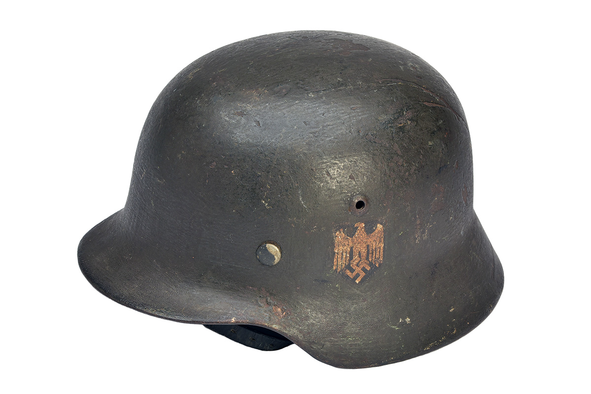 pre or early war in dark green with eagle & swastika decal on left side, inside rim stamped 'NS64', the rear rim stencilled in black 'Gef. Rust', complete with laced liner and chin-strap, all original