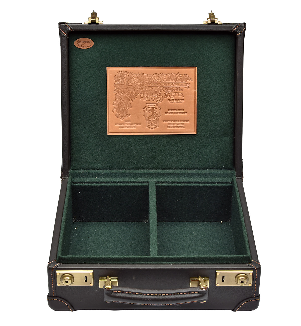 for approx. 200 cartridges, the interior lined with green baize, a Pietro Beretta trade label, two brass locks, leather carry handle, the leather exterior marked with a Beretta trade mark and with initials 'M d'A-I'