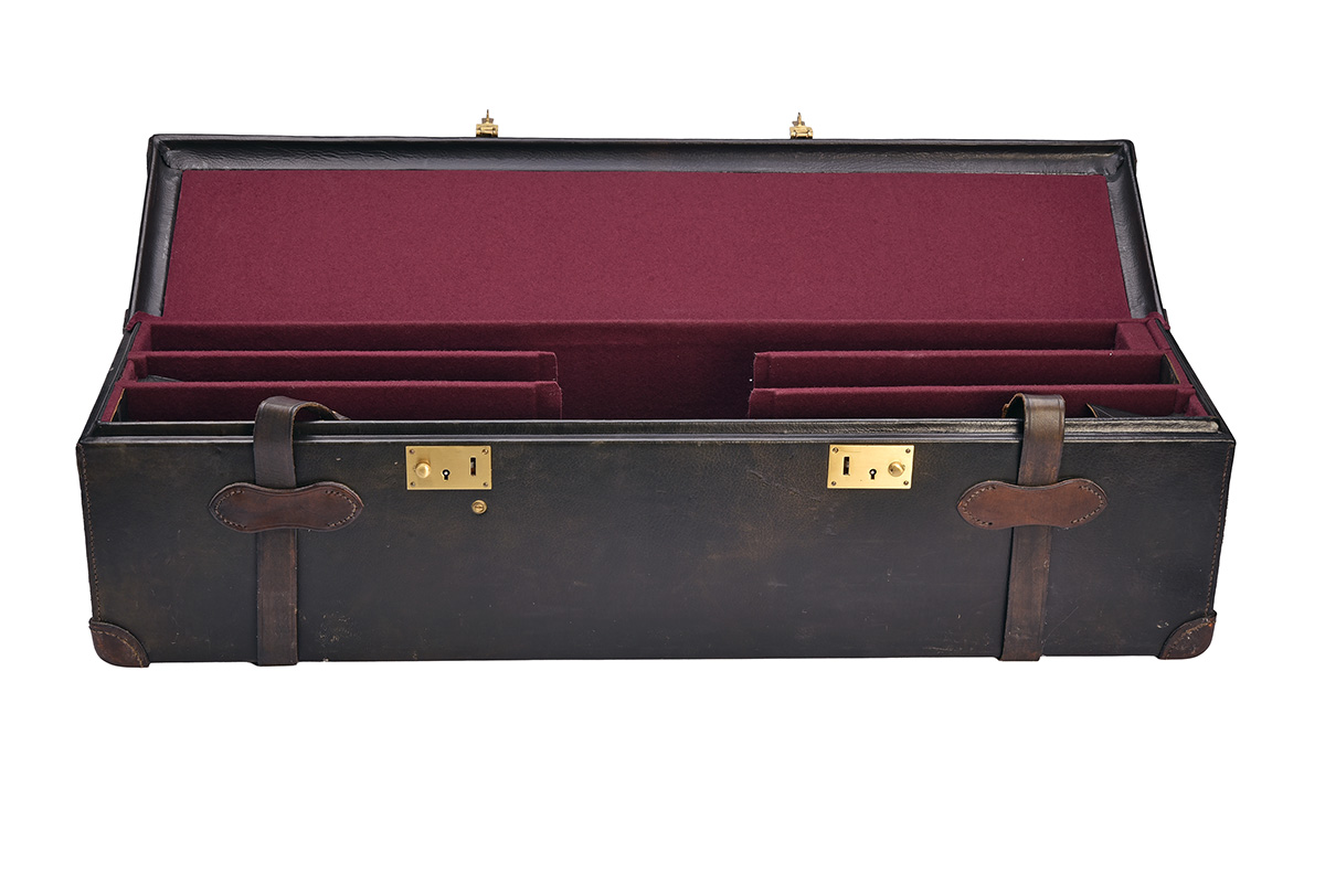 fitted for 30in. barrels, the interior lined with maroon baize, two brass locks (including keys), the leather exterior marked 'M d'A-I'