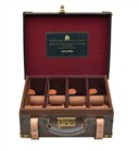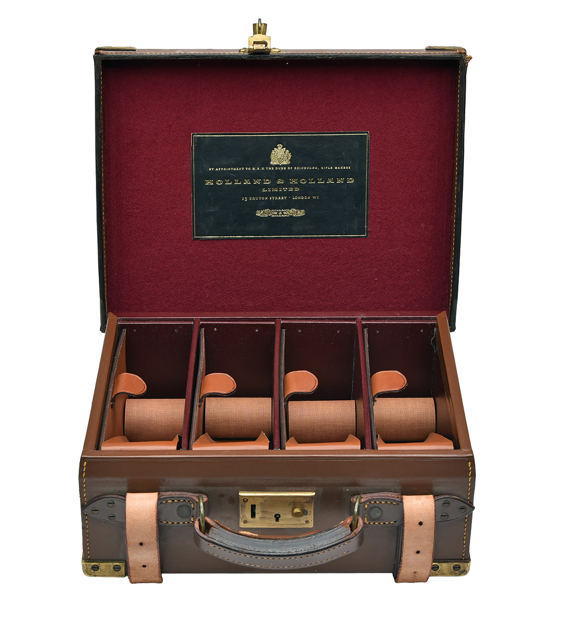 for approx. 200 cartridges, the interior lined with maroon baize, a leather gold-tooled Holland & Holland trade label, brass lock (key missing), the leather exterior marked 'M d'A-I'