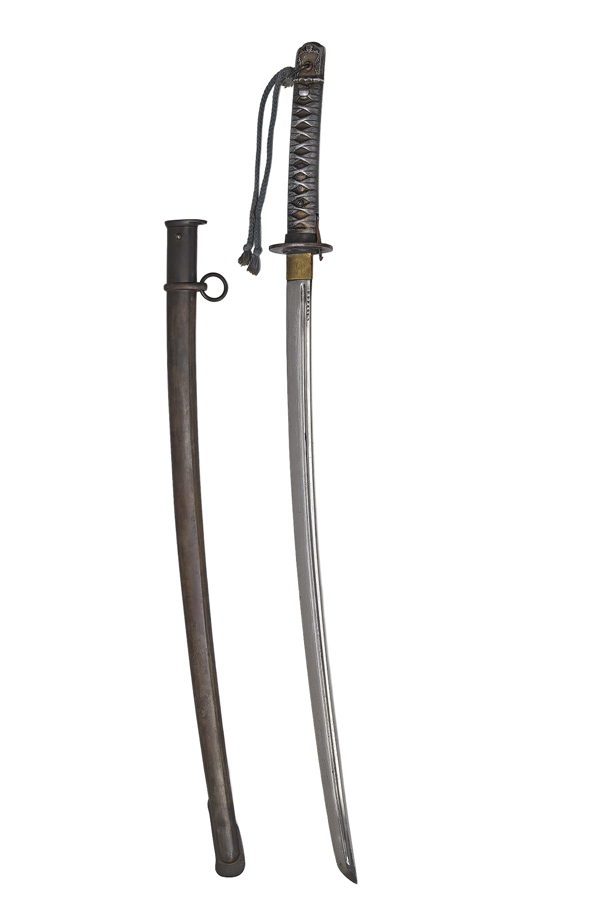 circa 1943, with 27 1/2in. slightly curved blade (lightly cleaned and re-polished), narrow fuller to the back edge finishing just short of the tip, plain iron oval tsuba, alloy hilt cast in imitation of binding, blue rope tassel (possibly associated) and in its matching number iron scabbard with throat-lock