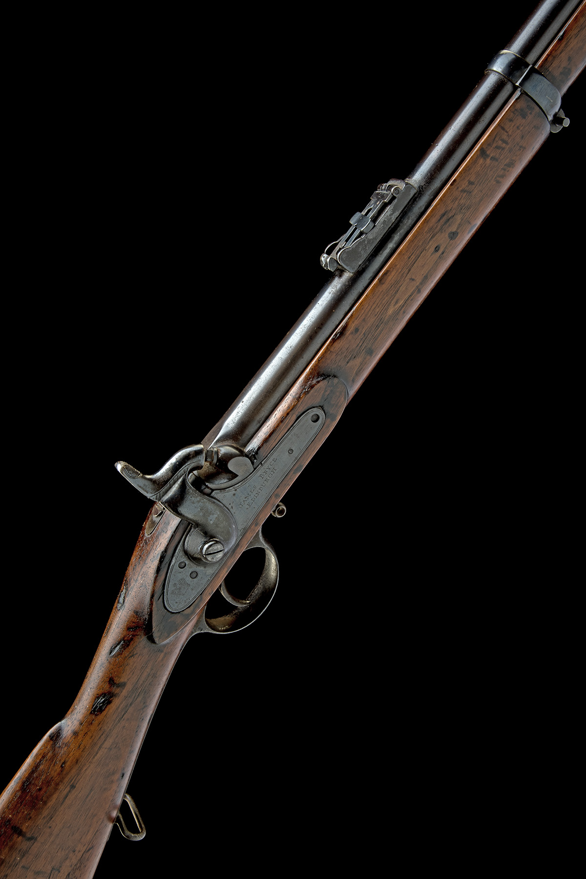 circa 1858, with round 33in. barrel, block and blade fore-sight, elevating ladder rear-sight, commercial Birmingham proofs, solid top-tang, borderline engraved military style lock signed 'JAMES BRYCE, EDINBURGH' (refreshed), walnut three-quarter stock with iron furniture including two barrel-bands and bayonet bar to muzzle, the whole an older refinish