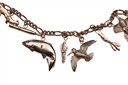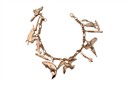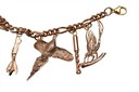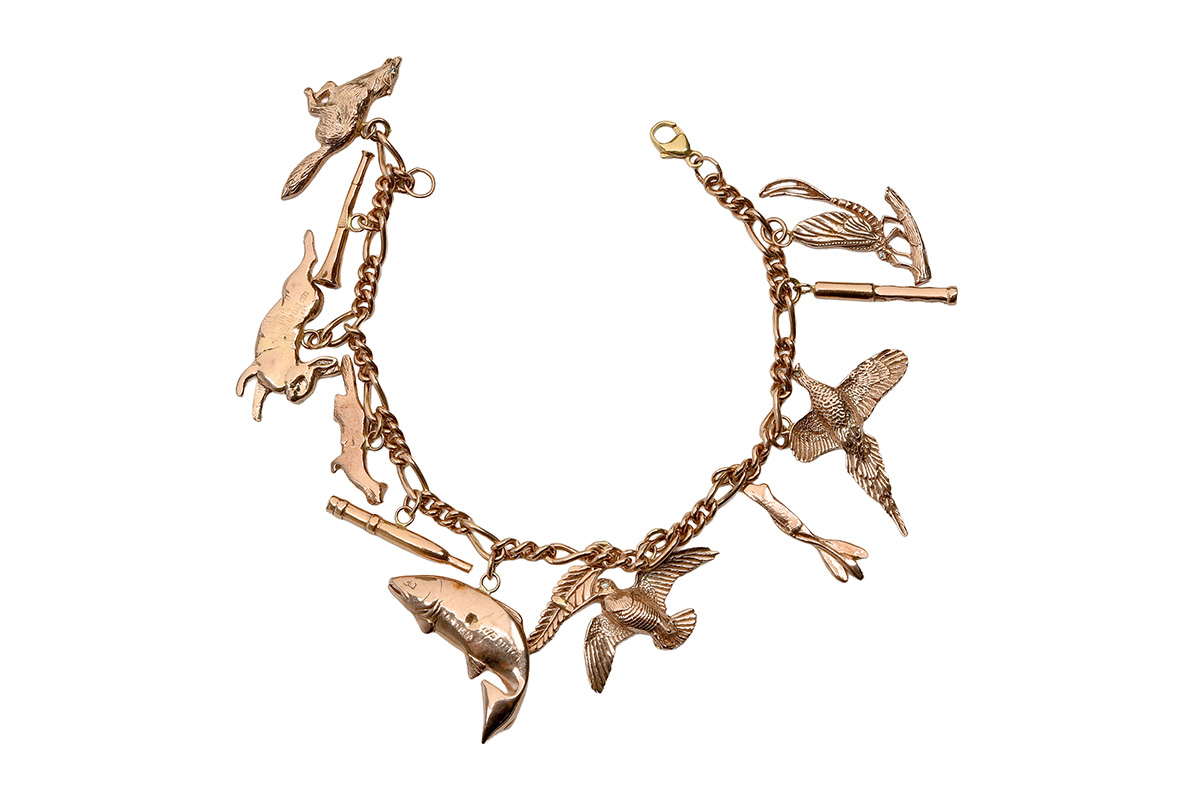 with 12 solid charms of a running fox, a hunting horn, a bolting rabbit, stoat, fly rod handle, leaping salmon, bracken frond, flushed woodcock, wheat straws, pheasant, fishing priest, resting mayfly, lobster claw clasp, weight 31.11g, all with diamond eyes where appropriate, in a leather case