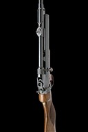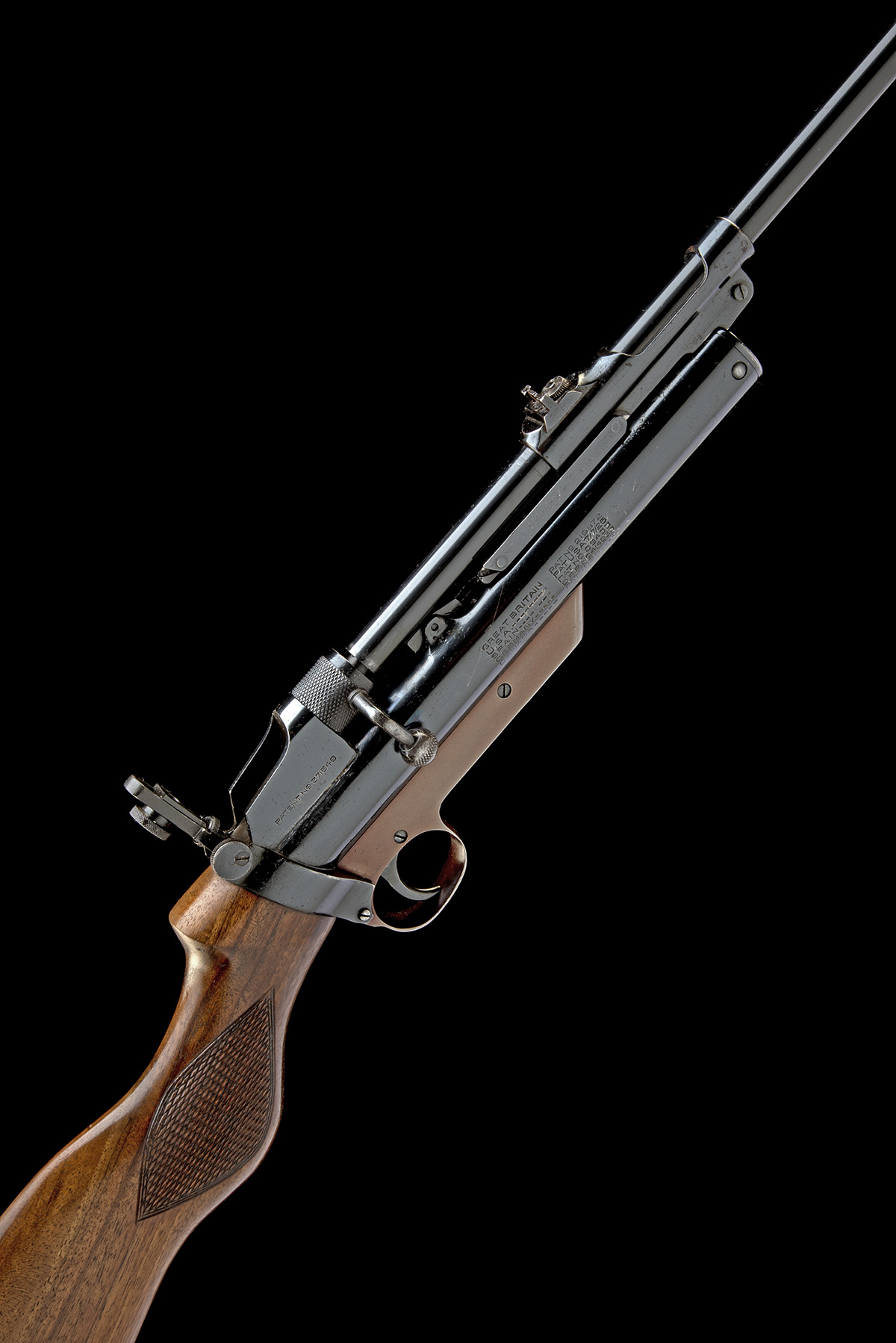 late model circa 1936, with three interchangeable 25 1/2in. barrels, all matching numbers but the .177 and .25 examples reproduction, ramp fore-sights, elevating notch rear-sight, bolt-action barrel-lock, the breech with folding peep-sight, air-chamber with model and patent details, the trigger unit with makers details, chequered walnut semi saw-handled butt-stock, ribbed vulcanite heel-plate and no provision for fore-end, the whole refinished and in a later oak case lined and compartmented in dark green baize and complete with a facsimile copy of 'Hints on Air Rifle Shooting' by F.E. Morton and a selection of pellets