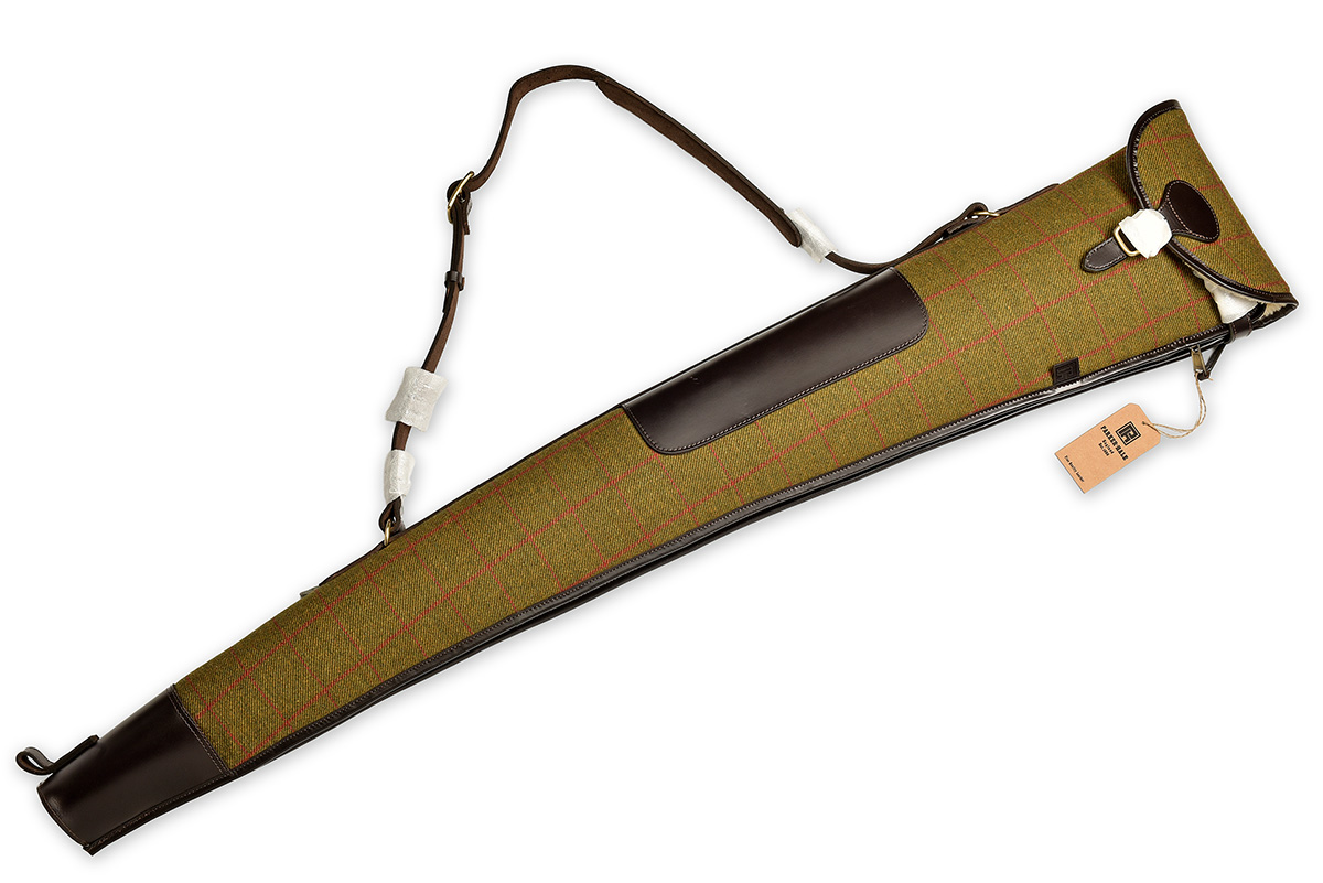 PARKER-HALE A VIRTUALLY UNUSED 'HAMBLEDON' FLEECE-LINED TWEED AND LEATHER SINGLE GUNSLIP,