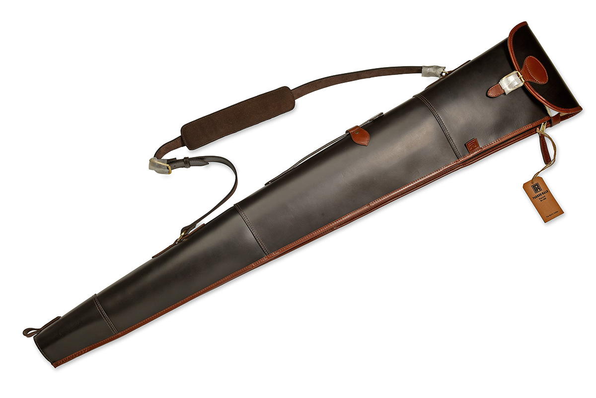 PARKER-HALE A VIRTUALLY UNUSED 'WICKHAM' FLEECE-LINED DARK BROWN AND BRANDY LEATHER SINGLE GUNSLIP,