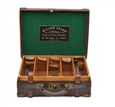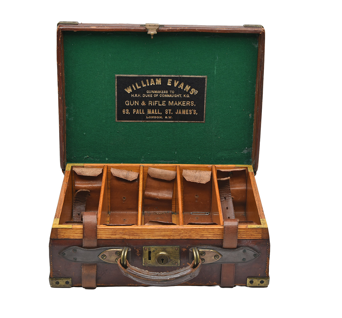 for approx. 250 cartridges, the lid interior lined with green baize, a leather gold-tooled William Evans trade label, four removable dividers, five leather lifters, brass lock (missing key), the lid exterior embossed with 'C.M.K' and blank brass escutcheon