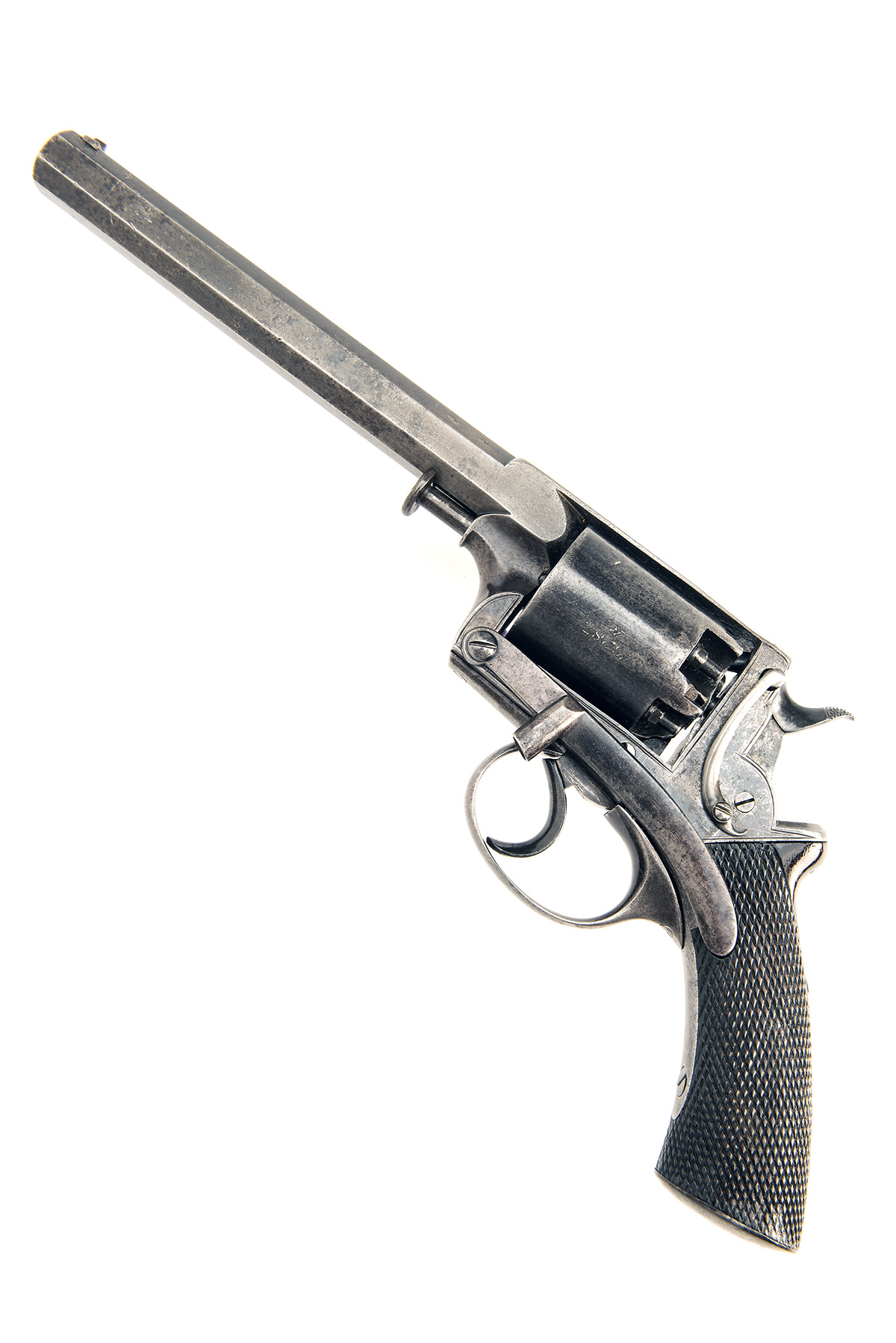 circa 1858, with blued octagonal 7 3/8in. barrel, the top-strap signed 'DEANE ADAMS & DEANE LONDON', plain numbered five-shot cylinder, borderline engraved solid frame (chipped behind rear-sight) with sliding safe to right hand side and marked 'B487' ADAMS' PATENT No. 16287R', spurred hammer, chequered walnut semi saw-backed one-piece grip, domed iron butt-cap, iron trigger-guard bow and fitted with a pivoting rammer to the left hand side of frame, strong traces of finish remaining