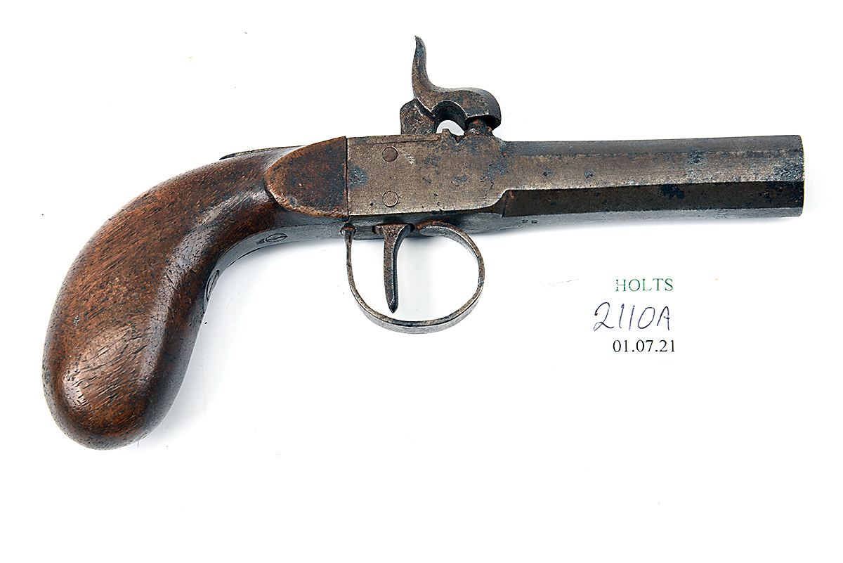 A 60-BORE PERCUSSION BOXLOCK POCKET-PISTOL, UNSIGNED, serial no. 88, Belgian circa 1850, with 2 5/8in. octagonal barrel, plain action, guarded trigger and bag-shaped walnut butt, 7in. overall