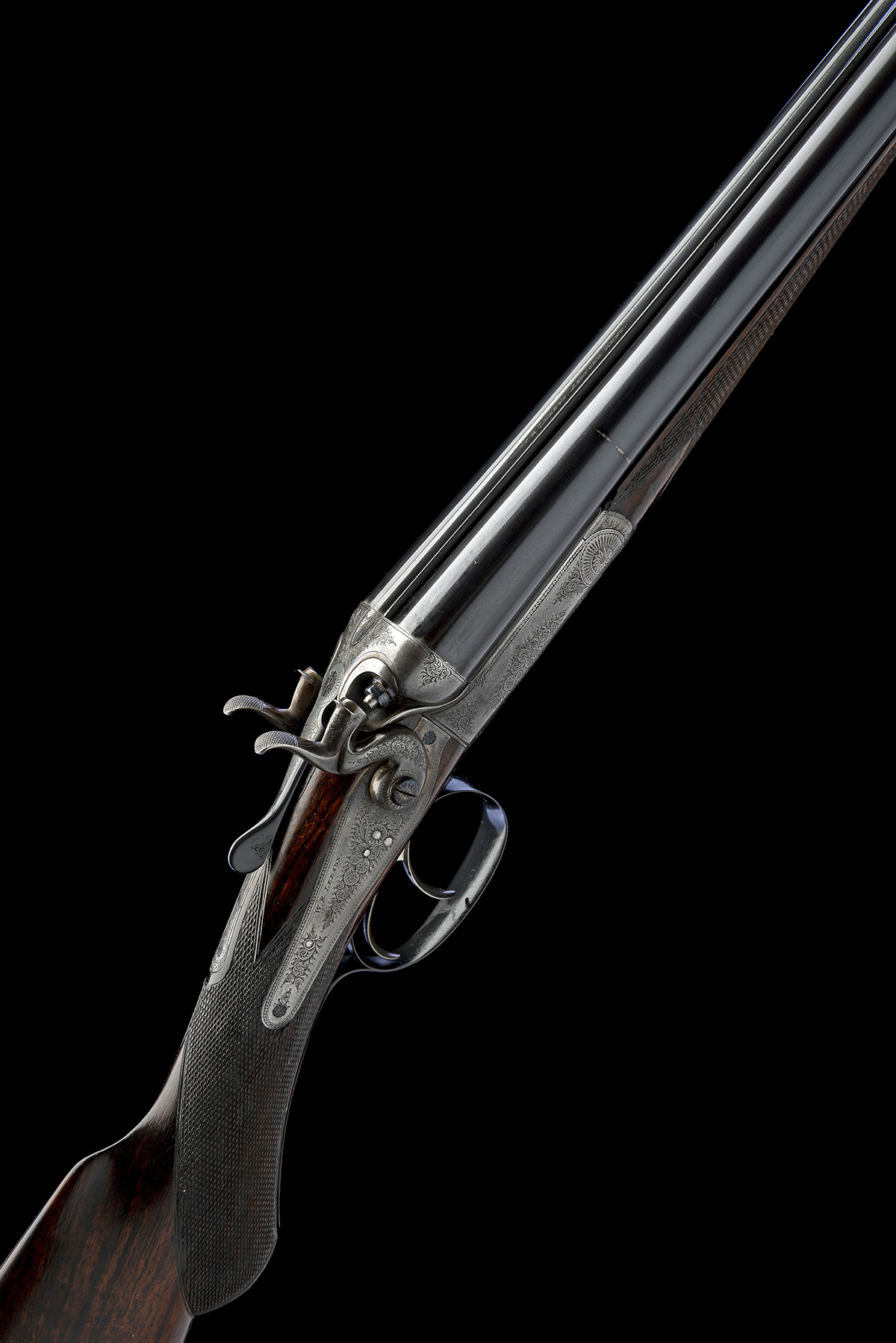 circa 1890, 28in. sleeved steel to damascus barrels, rib engraved 'W.R. LEESON. ASHFORD. KENT.', 2 1/2in. chambers, bored approx. imp. cyl. and 3/4 choke, carved percussion fences, rebounding locks, beaded border and partial acanthus scroll engraving, retaining traces of original colour-hardening and finish, 14 1/2in. figured semi-pistolgrip stock with steel heel and toe plates, weight 5lb. 15oz.