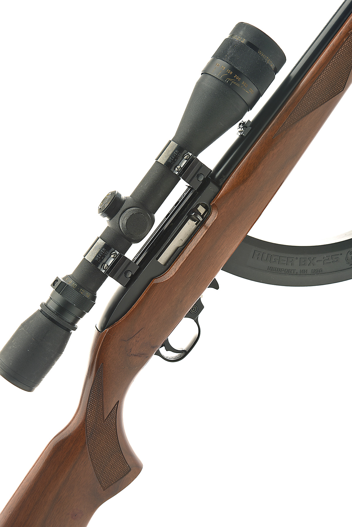 RUGER .22 L.R. 'MODEL 10/22' SELF-LOADING SPORTING RIFLE, serial no. 247-71417, for 1998, 19in. nitro barrel, threaded for sound moderator, block-mounted bead fore-sight, folding leaf rear-sight, fitted with a Simmons whitetail 4,5-14x40 telescopic sight, manual safety, detachable banana magazine with 3 x spare magazines, figured pistolgrip stock with recoil pad, sling eyes