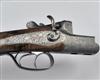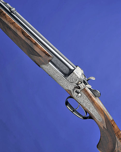 23 5/8in. Bohler-steel nitro barrels with matt sight-rib, flip-up open sights and ramp-mounted bead foresight, engraved with oak leaves at the breech ends, 3in. shot chamber, bored approx. 1/2 choke, quadruple-grip action with carved fences, rebounding back-action locks with carved hammers, set front trigger, the action, lockplates and furniture fully engraved with bold stylised acanthus scrolls and oak leaves, bright and blued finish overall, 14 1/2in. well-figured pistolgrip stock with sculpted cheekpiece, engraved steel pistolgrip-cap, sling swivels and including 1/2in. recoil pad, weight 6lb. 11oz.