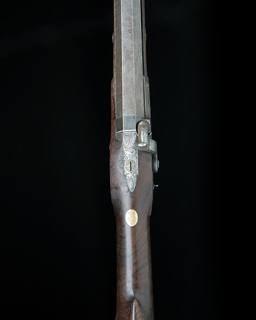circa 1840, possibly converted from an earlier flintlock, with browned octagonal 29 1/2in. barrel, replacement dove-tailed sights, engraved bands at breech with platinum line and vented plug, flat slightly curved borderline and scroll engraved lock, sliding safe behind the scroll engraved dolphin headed hammer, figured walnut half-stock with iron furniture including heel-plate and raised pistol-gripped lower tang, gold oval escutcheon to the wrist engraved with a crowned garter, flat underside to butt fitted with an eyelet for sling, twin barrel keys with plain gold escutcheons, under-barrel rib with original mahogany ramrod, the rear pipe with eyelet for sling (fore-end cracked and expertly repaired on left hand side); TOGETHER WITH a possibly associated storage case lined with green baize (compartments loose), the outer covered with a blacked canvas