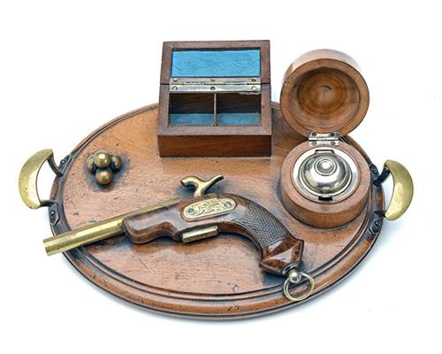 comprising of an ink-well and a nib storage box with decorative percussion type pistol