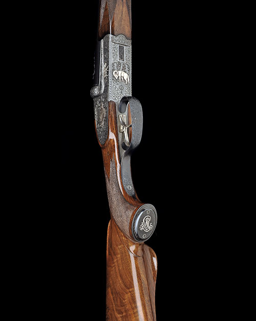 23 3/4in. nitro chopperlump barrels with matt sight rib, open sights and ramp-mounted bead foresight, the breech-end with claw mount bases, treble-grip action with side-bolsters, removable striker discs, automatic safety, set front trigger, the action and sideplates relief engraved and silver-inlaid with scenes of barking stag with hinds, running boar and the underside with a solitary mouflon, the whole surrounded by relief engraving of acanthus scrolls on a matted background, 14 7/8in. highly-figured stock with sculpted cheekpiece, rear sling swivel removed, blued and engraved pistolgrip-cap and including 1in. rubber recoil pad, fore-end with Deeley & Edge patent release catch, weight 8lb. 2oz.