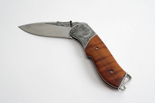A FINE OLIVE WOOD HANDLED FOLDING SPORTING KNIFE, recent, signed 'FARKA' with 4in. clip-point blade, the ricasso and back of blade fully scroll engraved, the left hand side of the handle engraved with the face of a cheetah and the right with a gazelle, the rear-half made from Olive wood, the butt with a scrolled lanyard hole (no scabbard)