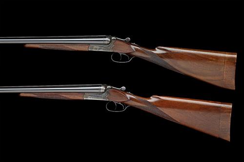 26 3/4in. (68cm) nitro reproved barrels (in 2016) with raised tapered file-cut ribs, 2 3/4in. chambers, bored approx. true cyl. and 1/4 choke (No. 774467) and 1/4 and imp. cyl. choke (No. 774838), scroll-back treble-grip actions with side-clips and side bolsters, automatic safeties, gold-pin cocking-indicators, border engraving, retaining much original colour-hardening and finish, 15 7/8in. stocks including 1 1/2in. wooden extensions, weights 6lb. 14oz. and 6lb. 11oz., in a Gunmark motor case