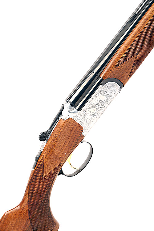 JOHN MACNAB .410 (3IN) 'LOWLANDER' SINGLE-TRIGGER OVER AND UNDER EJECTOR, serial no. 71372, 26in. nitro barrels with 7mm ventilated matt top-rib, 3in. chambers, bored approx. 1/4 and 1/2 choke, hold-open toplever, automatic safety with integral barrel selector switch, gold-washed trigger, lightweight action with game and stylised foliage engraving, the underside depicting the Macnab, silver finish, 14in. pistolgrip stock including buttplate, weight 6lb. 10oz.