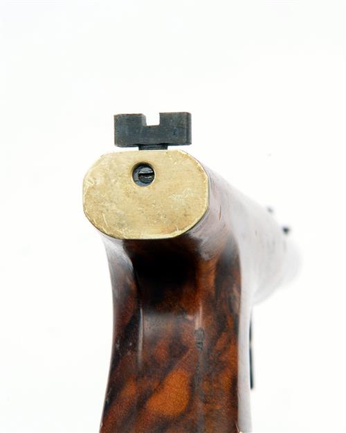 A REPRODUCTION .40 PERCUSSION PISTOL SIGNED J. ALCOCK, MODEL 'UNDER-HAMMER TARGET', serial no. X002, inline construction, with peacock-blued two-stage 6in. bull barrel, the top signed 'J. ALCOCK, TAUNTON, adjustable sights, brushed bright exposed hammer and guardless trigger, one-piece walnut butt with brass detail, appearing little used,