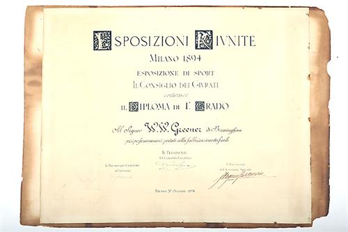 ESPOSIZIONI RIVNITE MILANO 1894, IL DIPLOMA DI 1 GRADO 25in. x 20 1/8in., unframed, some fading and staining, light damage to edges