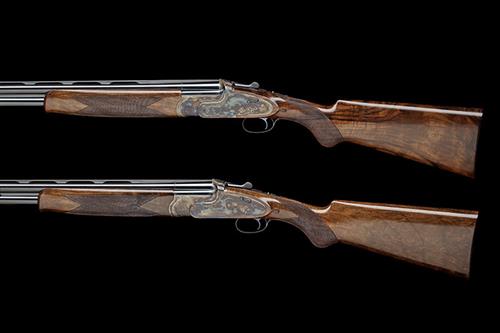 28in. nitro barrels with 8mm ventilated matt top-ribs, 3in. chambers, multichokes (with spares), hold-open toplevers, automatic safeties, hand-detachable lockplates, cocking-indicators, border and partial scroll engraving, retaining virtually full original colour-hardening and finish, 15in. semi-pistolgrip stocks, weight 8lb. and 8lb. 1oz. respectively, in a Jo Yorath fleece-lined leather double gunslip