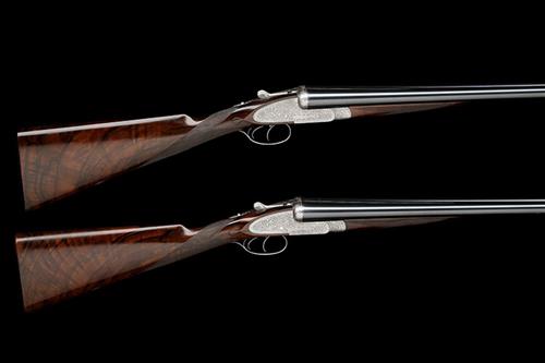 29in. nitro barrels, ribs gold-inlaid '1' and '2', tubes engraved 'HOLLAND & HOLLAND. 98, NEW BOND STREET. LONDON.', 2 1/2in. chambers, bored approx. true cyl. and 1/2 choke, minor dents and repairs, toplevers gold-inlaid '1' and '2', action faces with gas checks, automatic safeties with gold-inlaid 'SAFE' details, hand-detachable lockplates, gold-inlaid cocking-indicators, rolled-edge triggerguards, carved shell fences, best bold scroll engraving with floral bouquets, the undersides with elaborate cartouches engraved 'ROYAL HAMMERLESS EJECTOR', brushed finishes, 15 1/4in. highly-figured replacement stocks, matching fore-end woods, weight 7lb. (No.1) and 7lb. 2oz. (No.2), in their brass-cornered oak and leather case with internal protector flap