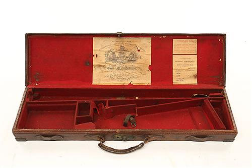 A BRASS-CORNERED LEATHER SINGLE HAMMERGUN CASE, fitted for 30in. barrels, the interior lined with red baize, a Chas Lancaster trade label, brass lock (key missing)