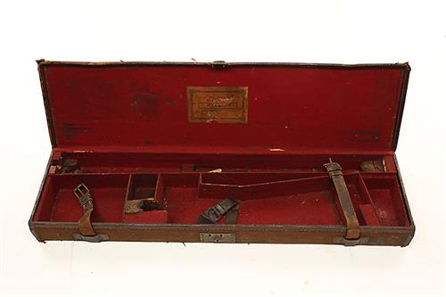AN ARMY & NAVY CANVAS AND LEATHER SINGLE HAMMERGUN CASE, fitted for 30in. barrels, the interior lined with red baize, an Army & Navy trade label, brass butterfly lock (key missing), handle broken