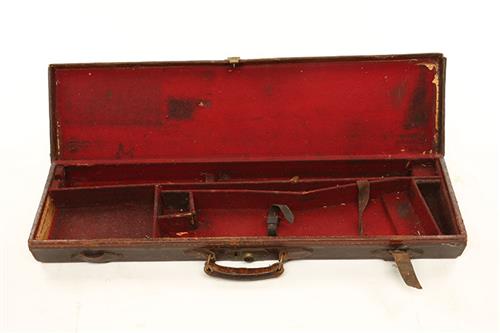 A LEATHER SINGLE GUNCASE, fitted for 30in. barrels, the interior lined with red baize, brass lock (key missing)
