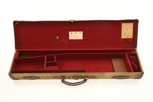 A CANVAS AND LEATHER SINGLE GUNCASE, fitted for 30in. barrels, the interior lined with maroon baize, brass lock (key missing)