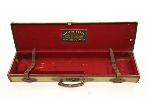 A WILLIAM EVANS CANVAS AND LEATHER SINGLE GUNCASE, fitted for 31in. barrels, the interior lined with red baize, boxing needs attention, brass lock (key missing),