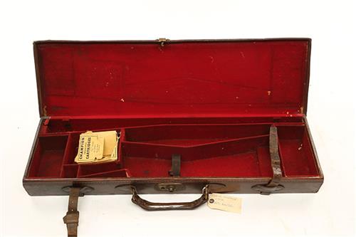 A LEATHER SINGLE GUNCASE, fitted for 31in. barrels, the interior lined with red baize, brass lock (key missing)