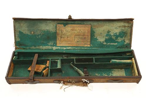 AN ARMY & NAVY CANVAS AND LEATHER SINGLE GUNCASE, fitted for 30in. barrels, the interior lined with green baize (moth and damp damage), an Army and Navy trade label, brass lock (key missing), handle missing, distressed