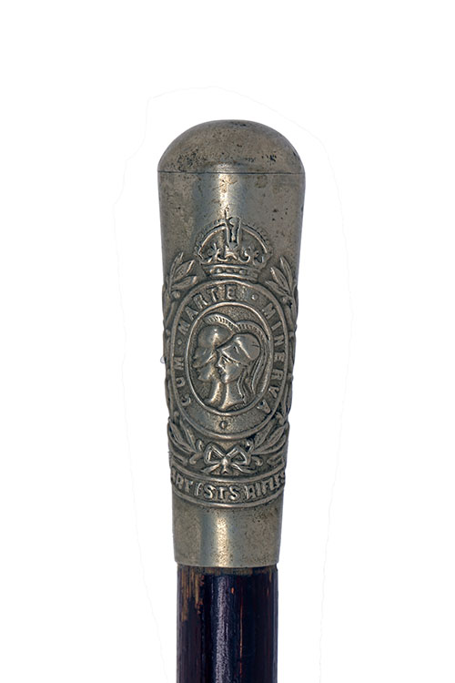 AN OFFICER'S WHITE-METAL MOUNTED CANE TO THE ARTISTS RIFLES, 27 3/4in. overall, with thin malacca cane body and white metal pommel and tip, the pommel embossed with Georgian crowned 'Artists Rifles' badge