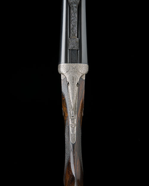 24 1/2in. nitro barrels, matt sight rib with open sights, folding leaf sight and with quickly-detachable telescopic sight mount bases, ramp-mounted bead fore-sight, treble-grip action with hidden third bite, removable striker discs, side bolsters, manual safety, articulated front trigger, the action and furniture fully engraved with fine acanthus scrollwork with ornate bordering, bright finish, 14 1/4in. figured pistolgrip stock, weight 7lb. 2oz.