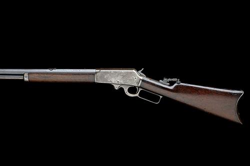 first quarter of the 20th century, with octagonal 26in. barrel, the top-flat signed with the maker's address and patent dates to 1893, the left hand side flat marked 'SPECIAL SMOKELESS STEEL', dovetailed nickel fore-sight blade, additional clip-on tunnel protector, rear-sight broken off and re-profiled into a dove-tail filler, slab-sided receiver, the top marked 'MARLIN SAFETY', adjustable peep-sight to the wrist, walnut butt-stock with iron crescent heel-plate, iron finger-lever, plain walnut fore-end and full-length magazine tube, traces of finish