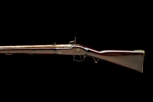 lock dated for 1864, with iron 30in. two-groove rifled barrel, boat-shaped fore-sight, rear-sight with one standing and one folding leaf, scarce variant bayonet bar with central locking notch mounted on the right side of muzzle, borderline engraved bar-action lock signed 'TOWER' with the date and a 'V.R.' crown device at tail, walnut full-stock with brass furniture including large patchbox in butt, iron stirrup swivels and iron under-barrel ramrod (woodwork with some wear, staining to iron surfaces); COMPLETE WITH its brass hilted double edged bayonet, no scabbard (bladed lightly rusted, some bruising to hilt