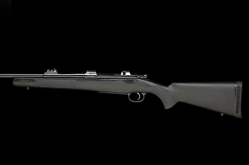 25in. nitro barrel with block mounted open sights and two folding leaf sights, ramp-mounted bead fore-sight, double square bridge receiver tapped for telescopic sight mounts, hinged floorplate with push button release, black synthetic pistolgrip stock, sling eyes, 14 1/4in. pull including in. ventilated rubber recoil pad, weight 10lb. 2oz.