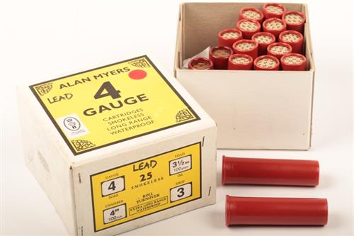 SEVENTEEN 4 BORE 4 IN SHOTGUN CARTRIDGES CONTAINED IN AN ALAN MYERS FACTORY BOX listing the contents as 4in & using 3 1/2 oz load of No 3 shot and smokeless powder the contents (15) all plastic bodied (including case heads) all unmarked in salmon red plastic with overcards confirming the use of No3 shot, together with 2 vintage paper bodied examples by Eley with overcards fo use of BB shot