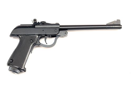 A BOXED .177 BREAK-BARREL AIR-PISTOL SIGNED PREDOM LUCZNIK, MODEL KL170, serial no. 03612, for 1977, with 9in. barrel, adjustable sights, blacked receiver and black plastic chequered grips, complete with its maker's pasteboard carton (worn) the pistol appearing little used