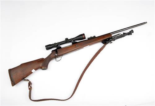 SAKO .270 'L61R' BOLT-MAGAZINE SPORTING RIFLE, serial no. 0421, 24 3/4in. nitro barrel, threaded for sound moderator, fore-sight missing, tangent rear-sight, fitted with a Simmons 3-9x40 telescopic sight, manual safety, bipod, hinged floorplate, 13 3/4in. pistolgrip stock (including recoil pad) with cheekpiece, leather sling
