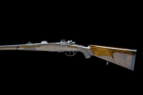 23 5/8in. nitro reproved barrel (in 2017) with engraved block-mounted open sights and ramp-mounted bead fore-sight, receiver (with thumb cutout) with quickly-detachable telescopic sight mount bases, side wall engraved 'MOD. 98 No. 6452 / 6161', germanic scroll engraved butterknife bolt handle, tang safety, hinged floorplate engraved with scrollwork surrounding a central depiction of a walrus, lever release, set triggers, pistolgrip two piece full stock with sculpted cheekpiece, sling swivels, horn pistolgrip-cap and fore-end finial (some losses to finial), 16 1/8in. pull including 1 1/4in. wooden extension and 7/8in. rubber recoil pad, weight 7lb. 3oz.