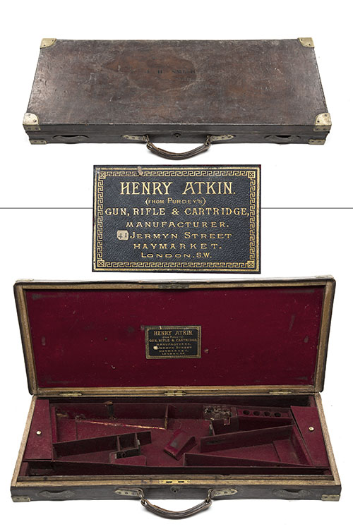 fitted for 30in. barrels, the interior lined with red baize, a leather gold-tooled Henry Atkin trade label, central brass push-button lock (key missing), the lid exterior embossed with 'J.H. SMITH, COBTHORNE, OUNDLE'