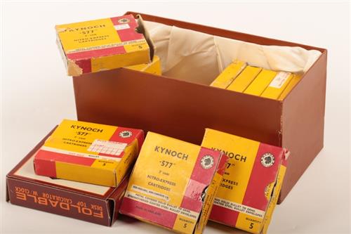 SIXTY SIX .577 3 IN FIRED NITRO-EXPRESS BIG GAME RIFLE CARTRIDGE CASES BY KYNOCH in factory boxes (for Berdan priming)