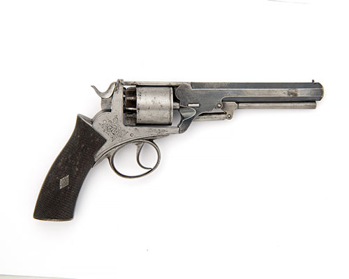 circa 1858, with blued 6in. barrel (traces of finish), engraved muzzle, scroll engraving to breech, the top-strap signed 'WILLIAM DOOLEY, LIVERPOOL' (refreshed, possibly spurious), brushed bright borderline and scroll engraved frame, plain cylinder with tramline to leading edge and numbered chambers, spurred hammer, guarded trigger and chequered walnut grip with scroll engraved heel-plate, the underside of barrel fitted with an articulated loading lever, together with its original walnut storage case compartmented and lined in dark green baize, the inside of lid with 'Dooley' trade label (possibly added), and complete with a period mould, flask, cap-tin, lubricating compound, oil bottle and cleaning rod, with a later nipple key