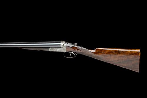 30in. nitro reproved barrels, the rib engraved 'W.R. PAPE. NEWCASTLE-UPON-TYNE. WINNER OF THE LONDON GUN TRIALS IN 1858. 1859. 1866. & 1875.', 2 1/2in. chambers, bored approx. treble-grip action, automatic safety with gold-inlaid 'SAFE' detail, beaded border and acanthus scroll engraving, 14 1/4in. figured stock, weight 6lb. 6oz., in a canvas and leather case