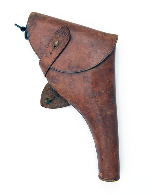 with military refinished 4in. barrel, holster guides at breech, fluted cylinder, break-open frame with stirrup locking catch, broad spurred hammer and chequered hard-rubber birdshead grips with lanyard ring at pommel, complete with a leather full-flap service holster for a 6in. model