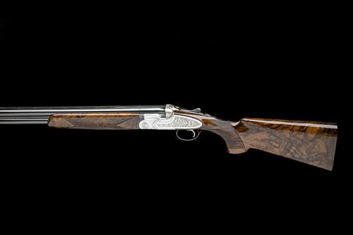 28in. nitro barrels with tapered ventilated matt top-rib, 2 3/4in. chambers, bored approx. 1/4 and 1/2 choke, hold-open toplever, automatic safety with integral barrel selector switch, double rolled-edge triggerguard, floral and acanthus scroll engraving, bright and blued finish overall, 14in. highly-figured pistolgrip stock, weight 7lb. 6oz., in its vinyl case